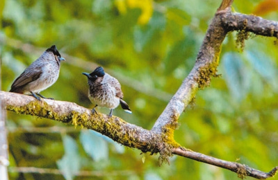 高黎貢山上,紅臀鵯在嬉戲。 |